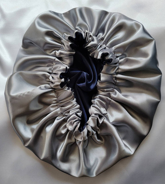 Navy Blue/Silver Charmeuse Satin Hair Bonnet REVERSIBLE